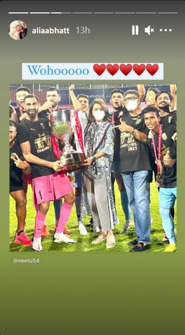 आलिया ने नीतू द्वारा शेयर की गई फोटो को अपने इंस्टा स्टोरी पर साझा करते हुए लिखा- 'Wohoooo'. रणबीर की टीम की जीत पर आलिया का यह रिएक्शन लाजिमी है. इससे पहले नीतू ने ट्रॉफी और टीम के साथ फोटो शेयर कर लिखा था- '@mumbaicityfc 2021 के चैंपियन्स'. गौरतलब है कि हाल ही में रणबीर कपूर के कोविड-19 पॉजिटिव होने का पता चला था. इस वजह से वे अभी सेल्फ क्वारनटीन में हैं. नीतू ने ही रणबीर की फोटो शेयर कर फैंस को एक्टर की तबियत की जानकारी दी थी.