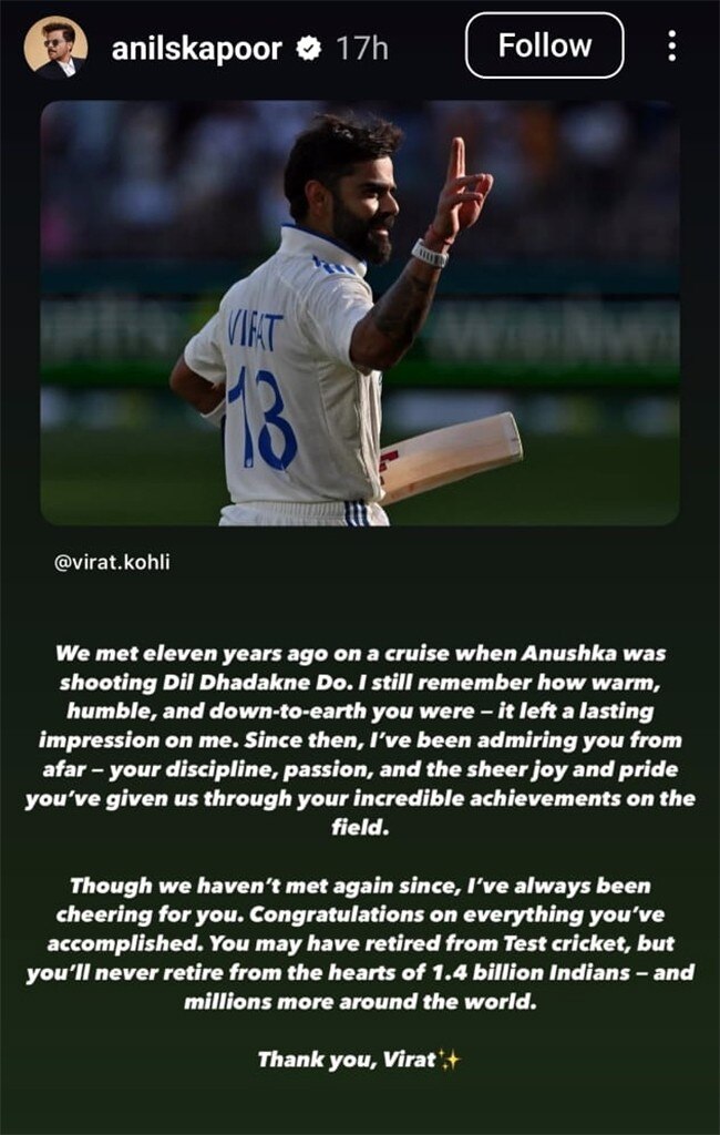 अनिल कपूर ने आगे लिखा कि भले ही इसके बाद विराट कोहली से उनकी दोबारा मुलाकात नहीं हो, लेकिन वह उनका हमेशा हौसला बढ़ाते रहे हैं. अनिल कपूर ने कहा कि उन्होंने टेस्ट क्रिकेट से जरूर संन्यास ले लिया है लेकिन वह लोगों के दिलों से कभी संन्यास नहीं ले सकते.
