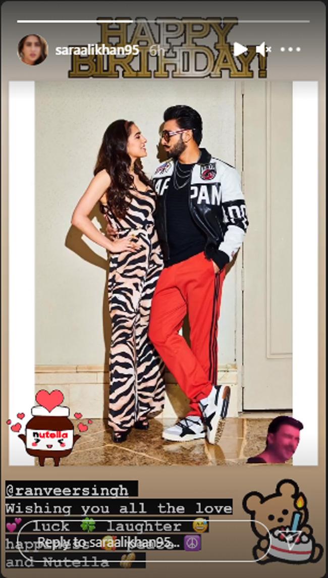 वहीं फिल्म सिम्बा में रही रणवीर सिंह की को-एक्ट्रेस सारा अली खान ने भी रणवीर सिंह की फोटो शेयर कर उन्हें जन्मदिन की बधाई दी और कैप्शन में लिखा "तुम्हें हर खुशी, हंसी, प्यार, मन की शांति मिले" इसी बीच आपको बता दें कि कल रात से लगभग बॉलीवुड के 83 सितारों ने रणवीर सिंह को बर्थडे विश किया है.