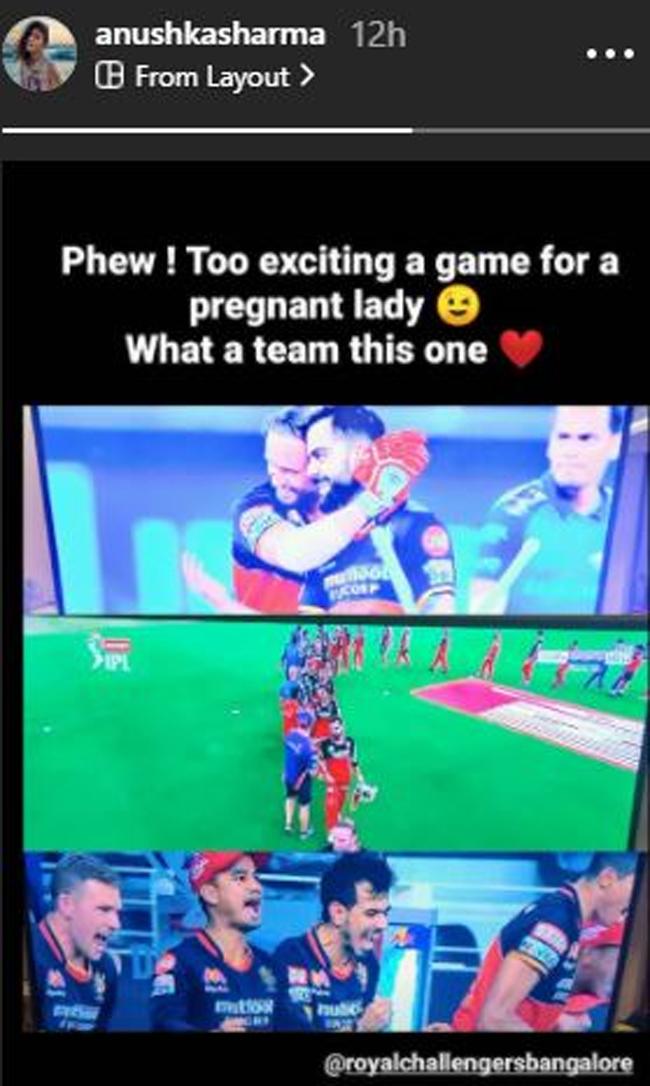 अनुष्का शर्मा ने इंस्टाग्राम स्टोरी पर लिखा- 'एक प्रेग्नेंट महिला के बहुत ही एक्साइटिंग गेम. क्या कमाल की टीम है'. वैसे मैच की बात करें तो रॉयल चैलेंजर्स बेंगलुरु और मुंबई इंडियन्स के बीच 28 सितंबर का मैच वाकई बेहद रोमांचक रहा. रॉयल चैलेंजर्स बेंगलुरु (RCB) ने मुंबई इंडियंस (MI) को सुपर ओवर में मात दे दी. इस सुपर ओवर में विराट कोहली ने विजयी चौका लगाया. ऐसे में पत्नी अनुष्का का चियर करना तो बनता है.