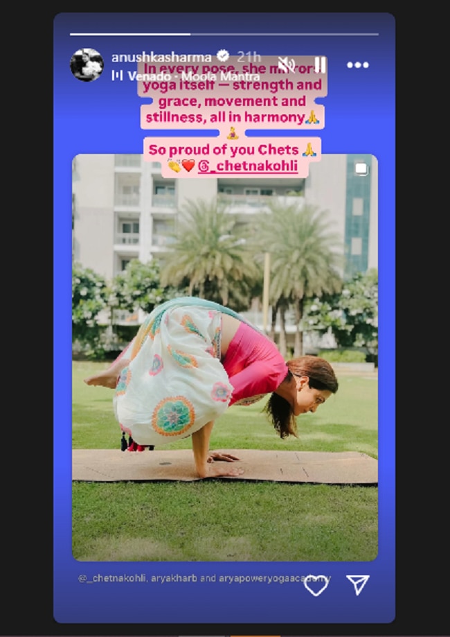 एक दुर्लभ और इमोशनल कदम में अनुष्का ने विराट कोहली की भाभी चेतना कोहली के लिए उठाया. उन्होंने अपनी अपनी इंस्टाग्राम स्टोरीज पर एक पोस्ट शेयर की, जिसमें चेतना योग करती नजर आ रही हैं. चेतना कोहली ने योग करते हुए अपनी दिवाली मनाई. इस मौके पर उन्होंने एक लंबी पोस्ट और अपनी कुछ फोटोज शेयर की थीं. इसी पोस्ट को अनुष्का ने अपनी इंस्टा स्टोरीज पर शेयर कर लिखा, 'हर मुद्रा में वह योग का ही प्रतिबिंब है, शक्ति और सुंदरता, गति और स्थिरता, सब कुछ सामंजस्य में. तुम पर बहुत गर्व है, चेट्स.' यह स्टोरी जल्दी ही वायरल हो गई, जिसने फैंस का ध्यान आकर्षित किया. चेतना ने बाद में इस स्टोरी को अपनी प्रोफाइल पर री-शेयर किया और लिखा, 'बहुत-बहुत शुक्रिया.'