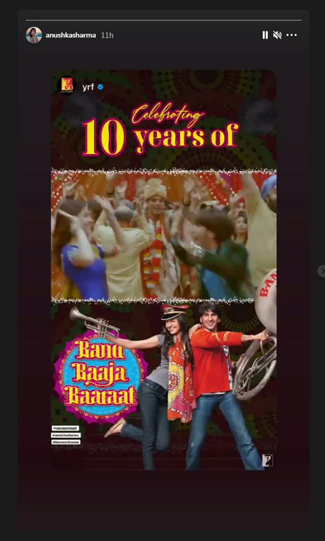 अनुष्का शर्मा ने अपनी इंस्टाग्राम स्टोरी पर फिल्म बैंड बाजा बारात का एक वीडियो शेयर किया है. तो वहीं रणवीर सिंह ने भी अपने बॉलीवुड करियर के 10 साल पूरे होने पर अपनी इंस्टाग्राम स्टोरी पर कई फोटोज शेयर कीं. इस फिल्म में रणवीर सिंह ने दिल्ली के लड़के बिट्टू शर्मा और अनुष्का शर्मा ने श्रुति कक्कड़ की भूमिका निभाई थी. यह दोनों वेडिंग प्लानर थे, जिन्हें प्यार हो जाता है.