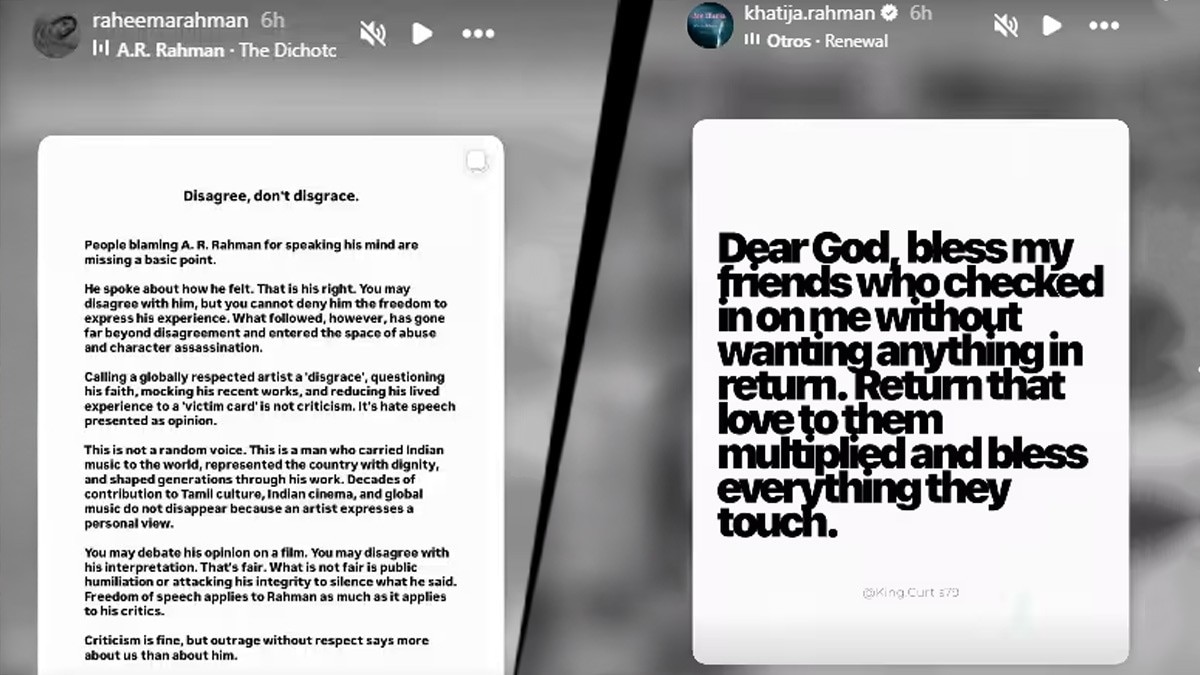 दरअसल मलयालम म्यूजिक कंपोजर कैलाश मेनन ने अपने इंस्टाग्राम पर एक लंबा नोट लिखकर लोगों से एआर रहमान से 'असहमत होने, अपमान न करने' के लिए कहा. इसे रहमान की दोनों बेटियों की तरफ से सपोर्ट मिला है.
