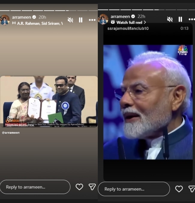 अमीन और उनकी बहनों खतीजा और रहीमा रहमान ने अपनी इंस्टाग्राम स्टोरीज पर पुरानी वीडियो और तस्वीरें पोस्ट की हैं. सभी ने अपने पिता एआर रहमान का समर्थन किया है. एक वीडियो में रहमान को क्रिकेट स्टेडियम में भारी भीड़ के सामने हाथ हिलाते हुए देखा जा सकता है. यहां स्पीकर पर उनका ऑस्कर विनर गाना 'जय हो' बज रहा है. इसके अलावा अमीन ने पिता रहमान की राष्ट्रपति द्रौपदी मुर्मू के साथ तस्वीर भी शेयर की है. इसमें रहमान, राष्ट्रपति से राष्ट्रीय पुरस्कार रिसीव कर रहे हैं.