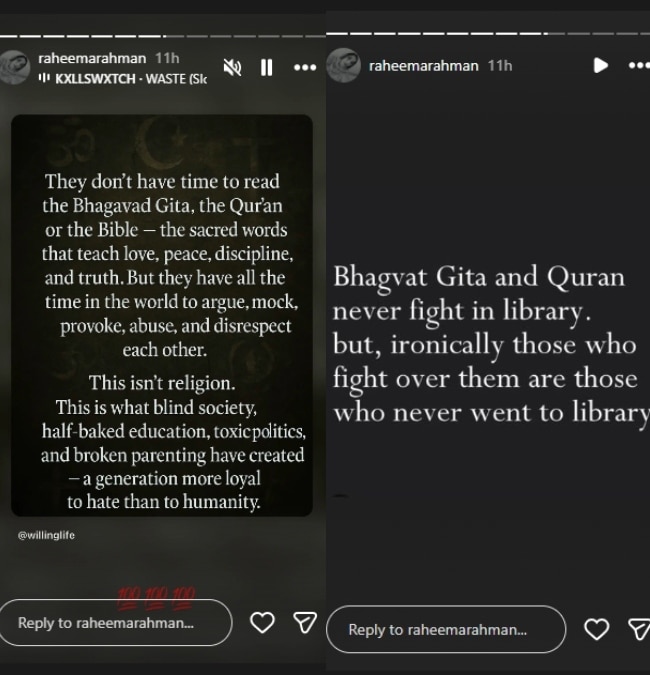 रहमान की छोटी बेटी खतीजा ने भी वही वीडियो और तस्वीरें अपनी इंस्टाग्राम स्टोरीज पर शेयर की हैं. तो बड़ी बेटी रहीमा ने नोट्स पोस्ट किए, जिसमें लोगों को सांप्रदायिक आधार पर बहस करने के लिए आड़े हाथों लिया गया. एक नोट में रहीमा ने लिखा, 'लोगों के पास भगवद्गीता, कुरान या बाइबल पढ़ने का समय नहीं है- वे पवित्र ग्रंथ जो प्रेम, शांति, अनुशासन और सत्य सिखाते हैं. लेकिन उनके पास एक-दूसरे से बहस करने, मजाक उड़ाने, उकसाने, गाली देने और अपमान करने के लिए सारा समय है.'
