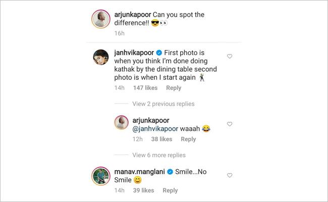दोनों फोटो में अर्जुन झूले पर बैठे हैं. फोटो में बस उनकी स्माइल में ही अंतर देखने को मिल रहा है. इस फोटो को शेयर करते हुए उन्होंने लिखा- क्या आप इसमें अंतर ढूंढ़ सकते हैं. इस पर जाह्नवी ने भाई अर्जुन की फोटो पर कमेंट करते हुए लिखा- 'पहली फोटो में आप सोच रहे हैं कि मैंने डाइनिंग टेबल के पास कथक खत्म किया और दूसरी तस्वीर में ये कि मैं अब फिर कब शुरू करूंगा.' इसके रिप्लाई में अर्जुन ने वाह लिखा.