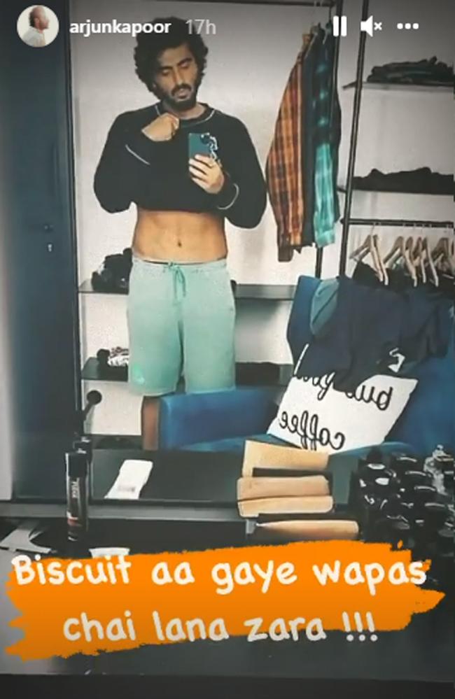 अर्जुन कपूर ने हाल ही में अपनी इंस्टाग्राम स्टोरी पर जिम से अपने शानदार ट्रांसफॉर्मेशन के बुमेरांग वीडियो और फोटो शेयर किए हैं. एक वीडियो में अर्जुन मिरर में अपने एब्स दिखाते हुए नजर आ रहे हैं. पहले वीडियो के साथ अर्जुन ने कैप्शन में लिखा- "बिस्किट आ गए वापस, चाय लाना जरा."