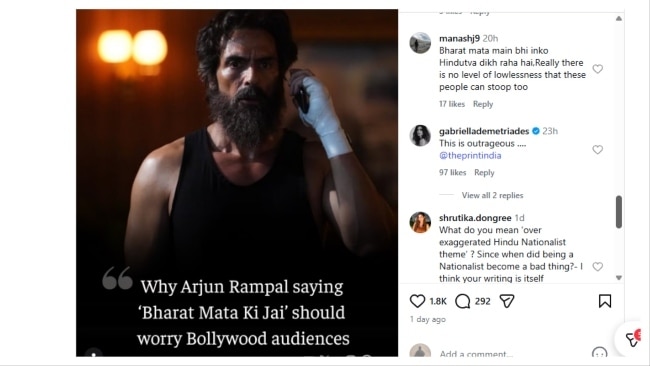 ये इवेंट HELLO! हॉल ऑफ फेम अवॉर्ड्स था, जिसमें अर्जुन रामपाल को एक अवॉर्ड से नवाजा गया था. इस पल की लेखिका शोभा डे ने आलोचना की है. अपने लेटेस्ट कॉलम में शोभा डे ने टाइटल लिखा- अर्जुन रामपाल का भारत माता की जय बोलना बॉलीवुड की ऑडियंस के लिए चिंताजनक होना चाहिए.' ये पोस्ट एक्टर की गर्लफ्रेंड गैब्रिएला डेमेट्रिएड्स को पसंद नहीं आया. गैब्रिएला ने आर्टिकल के कमेंट में इसकी कड़ी निंदा की. उन्होंने लिखा, 'यह बेहद निंदनीय है.'