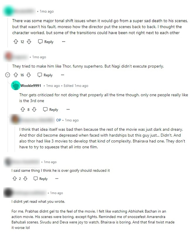 इस थ्रेड में एक यूजर ने प्रभास के किरदार, भैरव के कॉमिक एंगल की दिक्कत बताते हुए लिखा कि 'फिल्म जब बेहद उदास डेथ सीन से प्रभास के किरदार पर जाती है तो कहानी की टोन में एक बहुत बड़ा शिफ्ट आता है. मगर ये उनकी (प्रभास की) गलती नहीं है, बल्कि इस बात की है कि डायरेक्टर ने ऐसे सीन्स बैक टू बैक क्यों रखे.' एक और यूजर ने कहा, 'मैंने भी यही कहा था, मुझे ऐसा लगा कि उन्हें ज्यादा 'गूफी' बनाने की कोशिश हुई,जो नहीं करना चाहिए था.'