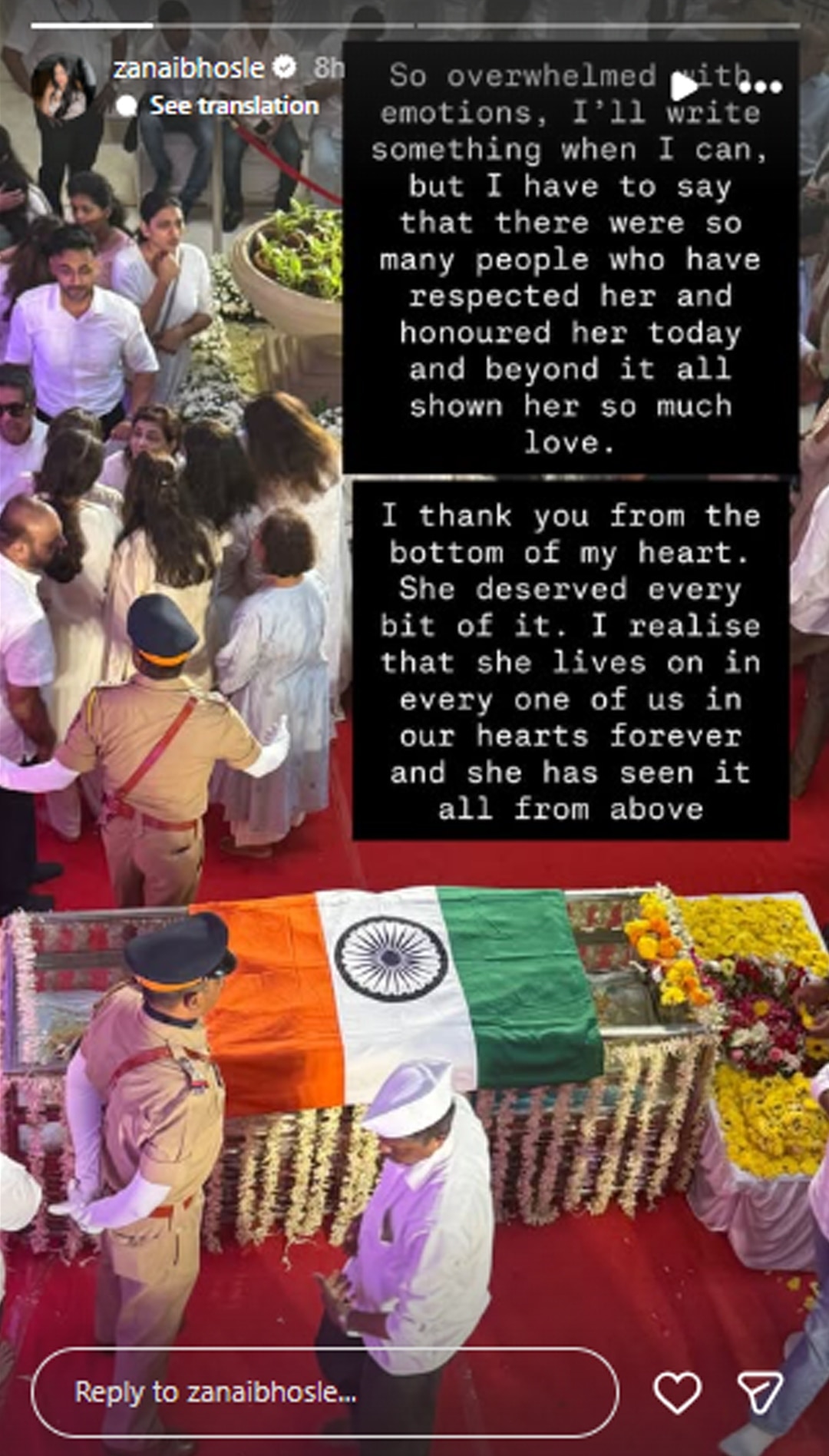 जनाई ने आशा भोसले के अंतिम विदाई की फोटोज को शेयर कर लिखा- इमोशंस से भरी हुई हूं. इसलिए जब हो सकेगा तब लिखूंगी. लेकिन इतना जरूर कहूंगी कि कई सारे लोग थे जिन्होंने मेरी दादी को अंतिम संस्कार के वक्त सम्मान दिया. उससे भी ऊपर उनके प्रति अपने प्यार को दिखाया. मैं तहे दिल से सभी का शुक्रिया अदा करती हूं. मेरी दादी ये सम्मान और प्यार डिजर्व करती थी. मैंने फील किया कि वो हम सबके दिलों में हमेशा जिंदा रहेंगी और ऊपर से उन्होंने सब कुछ देखा होगा.