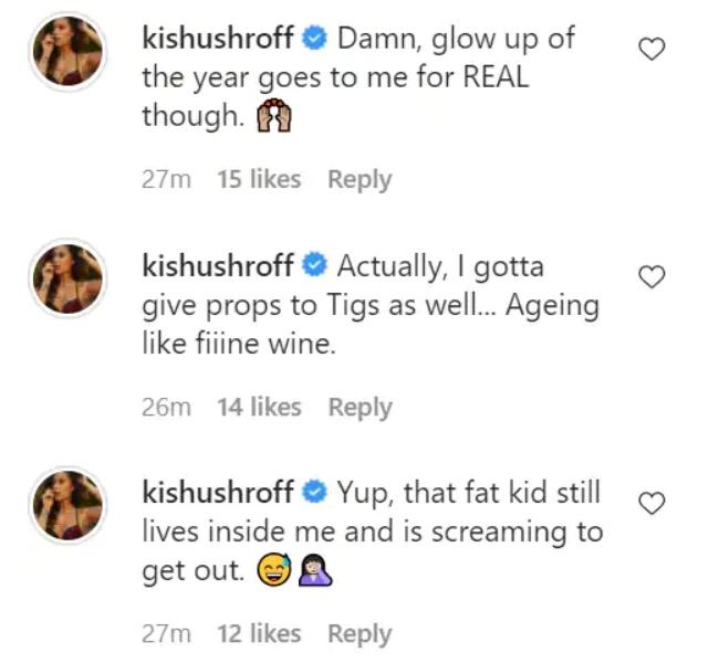 आयशा के इस पोस्ट पर बेटी कृष्णा श्रॉफ ने ढेरों कमेंट किए हैं. कृष्णा ने पहले कमेंट में लिखा, 'क्या बात है, ग्लो अप ऑफ द ईयर का खिताब तो मुझे ही मिलना चाहिए.' दूसरे कमेंट में कृष्णा बोलीं - 'असल में मैं टिग्स (टाइगर) को भी ख़िताब दूंगी वो भी किसी बढ़िया शराब की तरह उम्र में बड़ा हो रहा है.' एक अन्य कमेंट में कृष्णा ने लिखा - 'हां, वो मोटी बच्ची आज भी मेरे अंदर रहती है और बाहर आने के लिए चिल्ला रही है.'