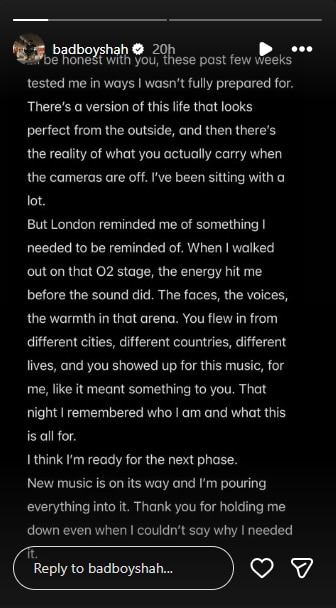 बादशाह ने लिखा है कि पिछले कुछ हफ्तों ने उनका इस तरह इम्तिहान लिया, जिसकी ना तो उन्हें उम्मीद थी ना तैयारी. रैपर ने कहा है, 'बाहर से देखने पर तो जिंदगी बहुत परफेक्ट लगती है. लेकिन जब कैमरा बंद हो जाता है, तब असल में जो बोझ आप अकेले में उठाते हो, वो अलग ही होता है. मैं इन दिनों बहुत कुछ अपने अंदर लेकर बैठा हूं.'