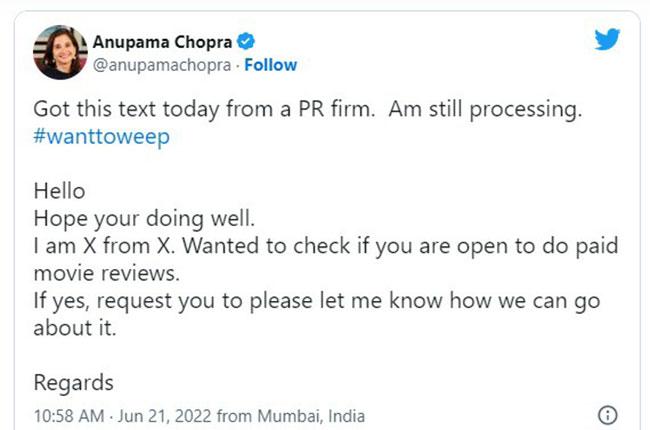 फिल्म का अच्छा रिव्यू लिखवाने के लिए पैसे देना, बॉलीवुड का एक ओपन सीक्रेट है. सोशल मीडिया पर आपने ऐसी बातें खूब सुनी होंगी, मगर जानी मानी फिल्म क्रिटिक अनुपमा चोपड़ा तक को पैसे ऑफर किए जा चुके हैं. पिछले साल अनुपमा ने एक ट्वीट में बताया था कि एक पी आर कम्पनी ने उन्हें पेड रिव्यू करने का ऑफर दिया है.