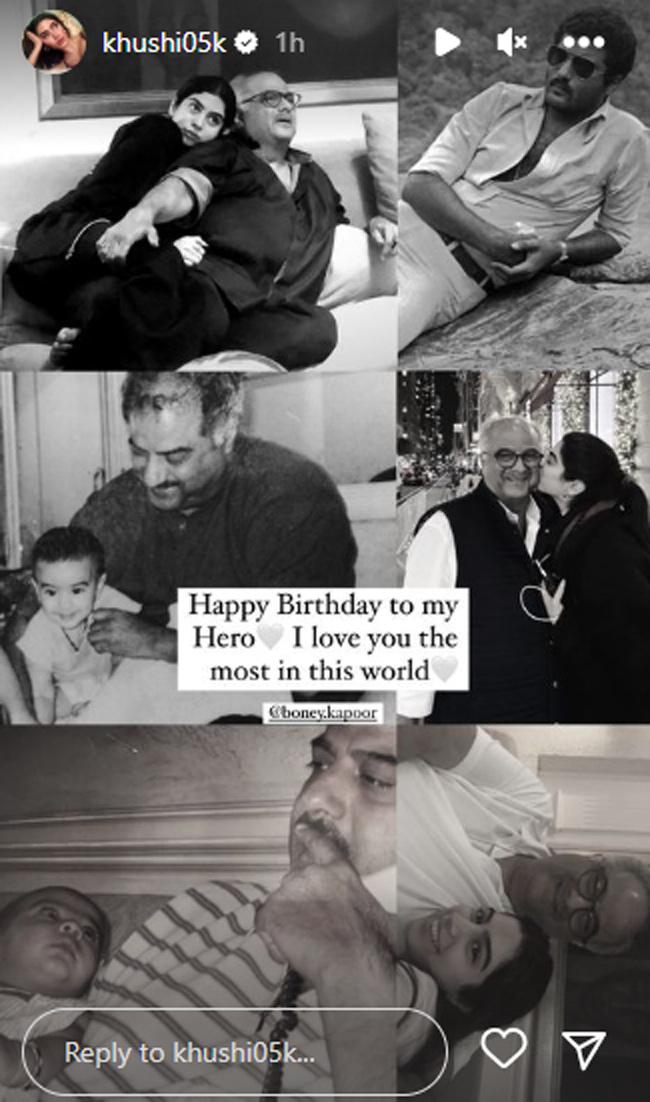 एक ओर जहां बोनी कपूर की बड़ी बेटी जाह्नवी कपूर ने वीडियो शेयर किया है. वहीं खुशी कपूर ने इंस्टाग्राम स्टोरी पर कोलाज फोटो लगाई है. खुशी कपूर की ब्लैक एंड व्हाइट पिक्चर में पिता-बेटी के अटूट प्यार की झलक है. पापा बोनी कपूर को बर्थडे विश करते हुए खुशी लिखती, मेरे हीरो को हैप्पी बर्थडे. मैं दुनिया में सबसे ज्यादा प्यार करती हूं.