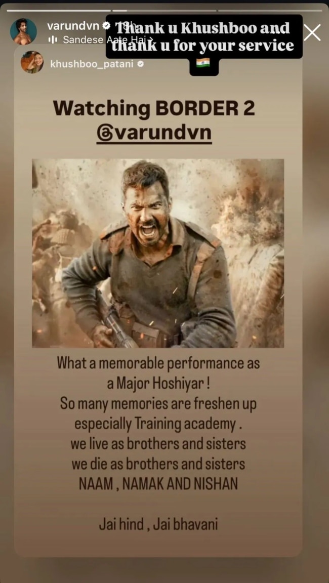 खुशबू ने 'बॉर्डर 2' से वरुण धवन की फोटो शेयर की. इसके साथ उन्होंने लिखा, 'बॉर्डर 2 देख रही हूं, वरुण धवन. मेजर होशियार के रूप में क्या यादगार परफॉर्मेंस दी है आपने. इतनी सारी यादें ताजा हो गईं, खासकर ट्रेनिंग अकैडमी की. हम भाई-बहनों की तरह जीते हैं, भाई-बहनों की तरह मरते हैं. नाम, नमक और निशान. जय हिंद, जय भवानी.'