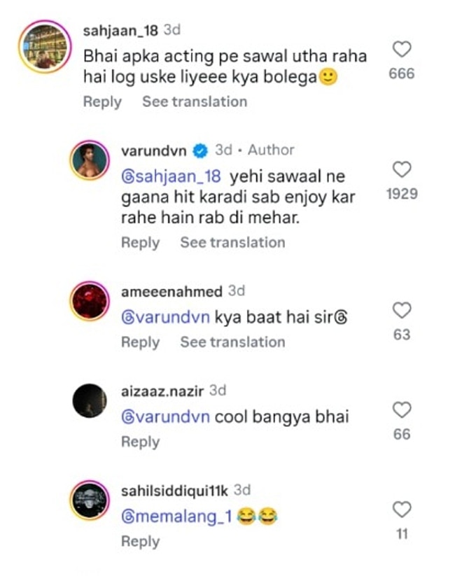 यूजर ने वरुण के पोस्ट पर लिखा- भाई आपकी एक्टिंग पर लोग सवाल उठा रहे हैं. उसके लिए क्या कहोगे? इस पर वरुण ने बहुत ही धैर्य से जवाब दिया- इसी सवाल ने गाने को हिट करा दिया. सब एन्जॉय कर रहे हैं. रब दी महर. वरुण के इस जवाब की खूब तारीफ हो रही है.