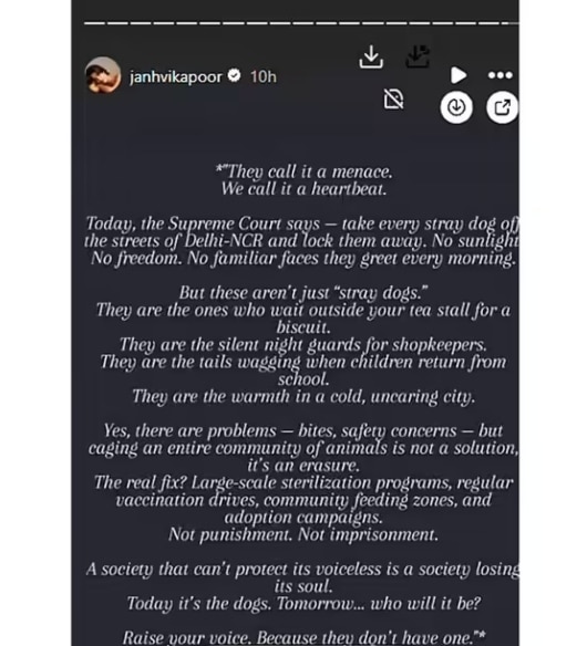 जाह्नवी कपूर ने इंस्टाग्राम पर एक भावुक पोस्ट शेयर की, जिसमें उन्होंने लिखा,"वो इसे खतरा कहते हैं. हम इसे धड़कन कहते हैं. आज सुप्रीम कोर्ट कहता है कि दिल्ली-एनसीआर की हर गली से कुत्तों को हटाकर बंद कर दो. न धूप मिलेगी, न आजादी, न वो अपने जान-पहचान वाले चेहरे देख पाएंगे, जिन्हें वो रोज सुबह हंसकर मिलते हैं. लेकिन ये सिर्फ 'आवारा कुत्ते' नहीं हैं, ये वही हैं जो आपकी चाय की दुकान के बाहर बिस्कुट के इंतजार में बैठते हैं, रात में दुकानदारों की चुपचाप पहरेदारी करते हैं, बच्चों के स्कूल से लौटने पर पूंछ हिलाकर उनका स्वागत करते हैं, और एक ठंडी, बेरुखी भरी शहर में थोड़ी सी गर्माहट होते हैं.''