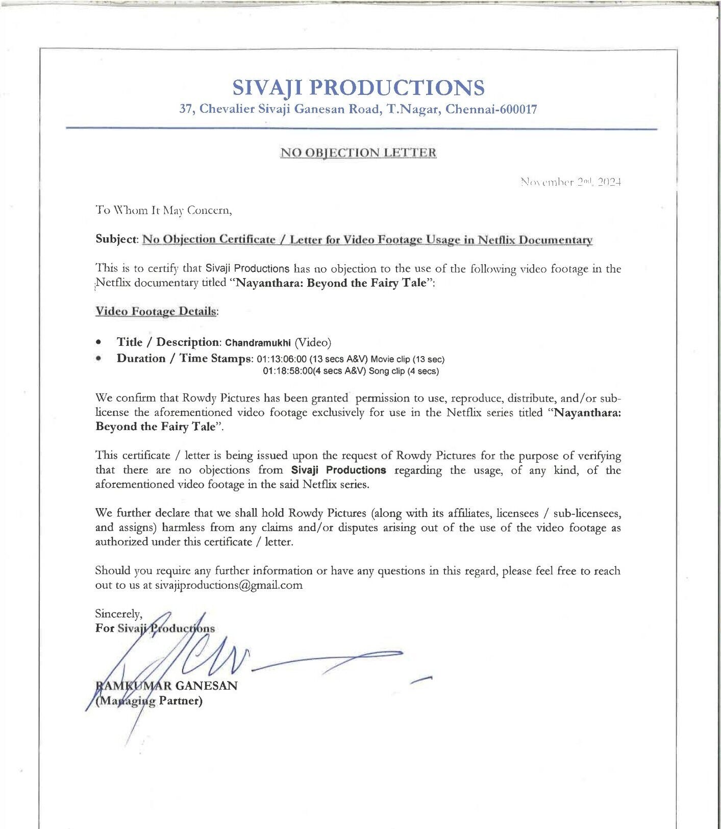 ट्रेड एनालिस्ट मनोबाला विजयबालन ने अपने एक्स (X) हैंडल पर शिवाजी प्रोडक्शन द्वारा नयनतारा को दिए गए NOC को शेयर किया. NOC में नयनतारा और उनके पति विग्नेश शिवन से शिवाजी प्रोडक्शंस के मांगे गए पैसों का कोई जिक्र नहीं है. इसमें लिखा है, 'शिवाजी प्रोडक्शन्स को नेटफ्लिक्स डॉक्यूमेंट्री "नयनतारा: बियॉन्ड द फेयरी टेल" में मूवी का कोई भी क्लिप यूज करने पर कोई आपत्ति नहीं है.'