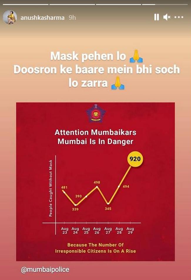 अनुष्का शर्मा ने अपने इंस्टाग्राम स्टोरीज में लोगों से मास्क पहनने की अपील की है. यही नहीं, अनिल कपूर, कियारा आडवाणी और करिश्मा कपूर जैसे सेलेब्स ने भी सोशल मीडिया पर पोस्ट करते हुए लोगों से मास्क पहनने की अपील की है.