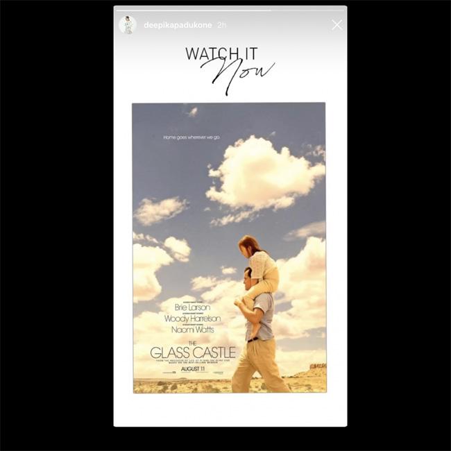 दीपिका ने अपनी इंस्टाग्राम स्टोरी पर बताया कि वे साल 2005 में आई फिल्म ग्लास कास्टल देख रही हैं. उन्होंने इस फिल्म का पोस्टर भी शेयर किया है. बता दें कि दीपिका इसके अलावा नेशनल ज्योग्राफिक चैनल पर अपनी एक्टिंग की यात्रा को लेकर भी बात करेंगीं. मेगा आइकॉन्स नाम के इस शो पर रणवीर सिंह और इम्तियाज अली भी दीपिका के साथ होंगे.