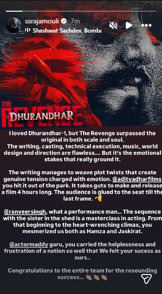 एस.एस.राजामौली ने इंस्टाग्राम पर स्टोरी शेयर करके 'धुरंधर 2' को इसके पार्ट 1 से कई गुना बेहतर बताया है. उन्हें फिल्म में हर चीज बेहद पसंद आई है. राजामौली लिखते हैं, 'मुझे धुरंधर-1 बहुत पसंद आई थी. लेकिन ये रिवेंज पार्ट ने तो ओरिजिनल को भी हर चीज में पीछे छोड़ दिया. राइटिंग, कास्टिंग, टेक्निकल चीजें, म्यूजिक, वर्ल्ड बिल्डिंग और डायरेक्शन — सब कुछ एकदम परफेक्ट है. लेकिन सबसे ज्यादा जो चीज इसे जमीन पर टिकाए रखती है, वो है इमोशनल दांव. राइटर ने ऐसे ट्विस्ट डाले हैं जो सच में टेंशन पैदा करते हैं और वो टेंशन इमोशन से भरे हुई थे.'