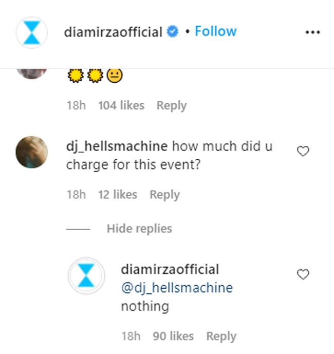 शख्स ने दीया के इंस्टाग्राम पोस्ट पर एक्ट्रेस से पूछा- इस इवेंट के लिए कितना चार्ज लिया है? सवाल बेतुका जरूर था जिसे नजरअंदाज भी किया जा सकता था, पर दीया ने जवाब देकर शख्स की बोलती ही बंद कर दी. दीया ने एक शब्द में लिखा 'Nothing', यानि कुछ भी नहीं. इस कमेंट के बाद दूसरे यूजर्स ने दीया का सपोर्ट किया है.