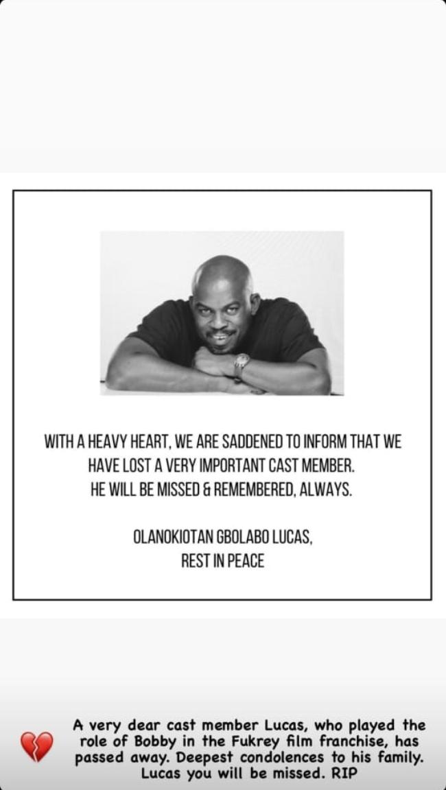 A dear cast member Olanokiotan Gbolabo Lucas, who played the role of Bobby in the Fukrey film franchise, has passed away. Deepest condolences to his family. You will be missed.. RIP. pic.twitter.com/l44qzqa8qb