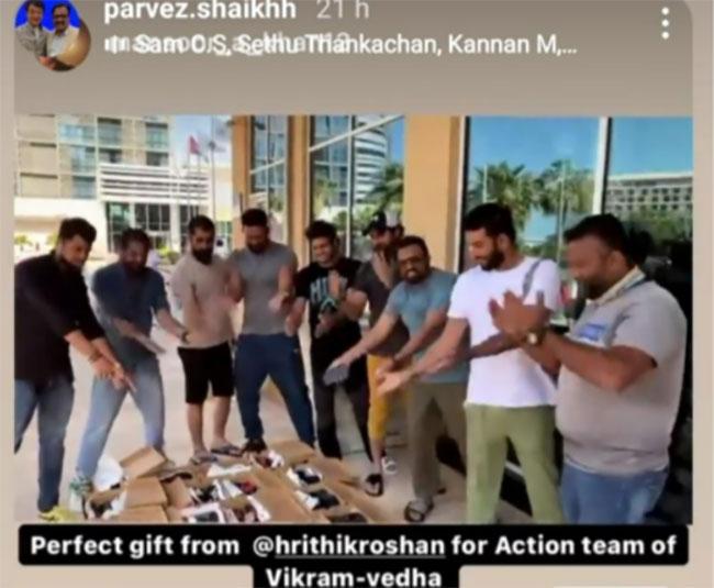ग्रीक गॉड के नाम से मशहूर बॉलीवुड एक्टर ऋतिक रोशन अपनी अपकमिंग फिल्म विक्रम वेधा की शूटिंग में बिजी हैं. ऋतिक रोशन को गिफ्ट्स के साथ अपनी टीम के प्रयासों की सराहना करने के लिए जाना जाता है. इस बार भी अपनी परंपरा को बरकरार रखते हुए ऋतिक ने विक्रम वेधा की पूरी एक्शन टीम को जूते गिफ्ट कर उन्हें सरप्राइज दिया.