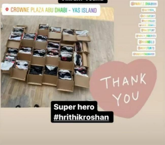टीम के स्टंटमैन ने अपने सुपरहीरो ऋतिक रोशन को परफेक्ट गिफ्ट देने के लिए अपने सोशल मीडिया पर धन्यवाद कहा है. यह पहली बार नहीं है जब ऋतिक रोशन ने गिफ्ट दिया है. उन्होंने मूवी वॉर और सुपर 30 के सेट पर भी चीजें गिफ्ट में दी थीं.