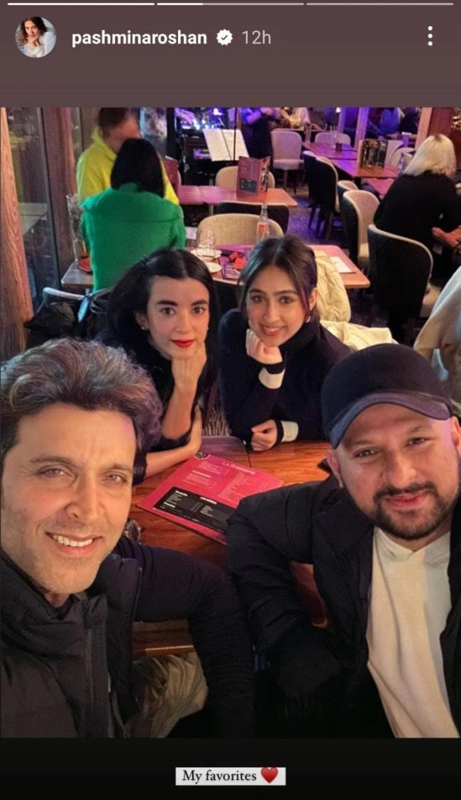 सबा और ऋतिक के नए फोटो को पशमीना रोशन ने शेयर किया है. पशमीना ने अपनी इंस्टाग्राम स्टोरी पर कपल के साथ बैठे हुए एक फोटो शेयर की. इस फोटो में सभी मुस्कुराते हुए पोज कर रहे हैं. फोटो के कैप्शन में पशमीना ने लिखा, 'मेरे फेवरेट.' इस तस्वीर में ईशान रोशन भी नजर आ रहे हैं. सभी ने ब्लैक आउट्फिट्स पहने हुए हैं.