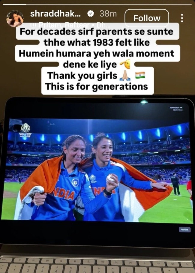 बॉलीवुड एक्ट्रेस श्रद्धा कपूर ने इंस्टाग्राम स्टोरी पर पोस्ट कर लिखा, 'दशकों से मां-पापा से सुनते थे कि 1983 वर्ल्ड कप जीत कैसी थी. हमें हमारा ये वाला पल देने के लिए शुक्रिया गर्ल्स... यह जीत पीढ़ी के लिए है.'