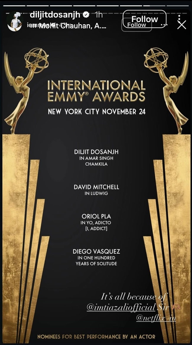 वहीं एक्टर दिलजीत दोसांझ ने अपने इंस्टाग्राम पोस्ट के जरिए एमी अवॉर्ड्स में नॉमिनेशन की जानकारी फैंस के साश शेयर की. उन्होंने अपने स्टोरी में लिखा, 'यह सब आपकी वजह से है, इम्तियाज सर.' बता दें कि विनर्स की अनाउंसमेंट 24 नवंबर को न्यूयॉर्क में होने वाले 53वें इंटरनेशनल एमी अवॉर्ड्स इवेंट में की जाएगी.