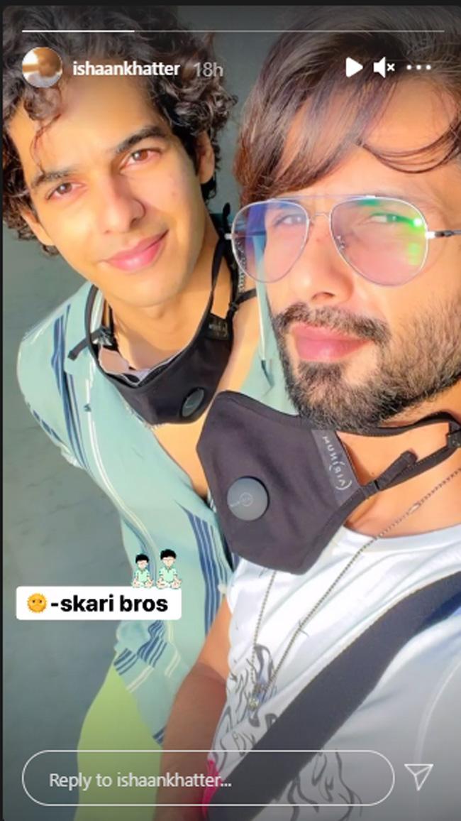 ईशान ने यह तस्वीर अपने सोशल मीडिया अकाउंट इंस्टाग्राम पर शेयर की है. फोटो को शेयर करते हुए एक्टर ने कैप्शन में लिखा, "धूप में skari ब्रदर्स" फोटो में देखा जा सकता है ईशान ग्रीन कलर की शर्ट पहने दिखाई दे रहे हैं और फोटो क्लिक कृते हुए एक्टर ने मास्क हटाया हुआ है. वहीं शाहिद कपूर भी व्हाइट टी-शर्ट और शेड्स में काफी हैंडसम दिखाई दे रहे हैं. दोनों की ये संस्कारी फोटो फैंस को भी बेहद पसंद आ रह है.