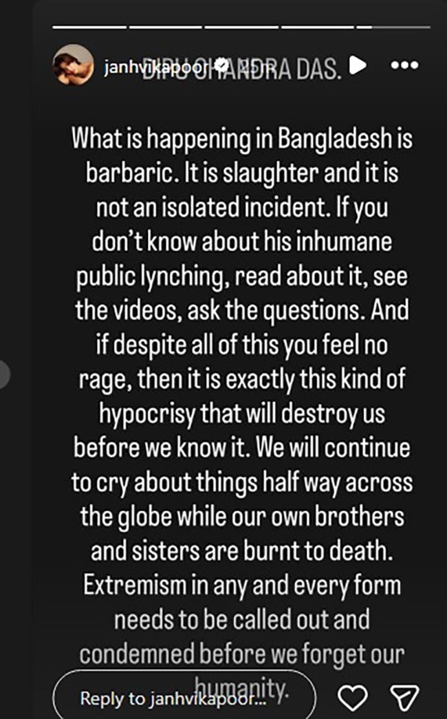 गुरुवार को जान्हवी कपूर ने अपनी इंस्टाग्राम स्टोर पर 'दीपू चंद्र दास' के नाम के साथ एक नोट पोस्ट किया. एक्ट्रेस ने लिखा, 'बांग्लादेश में जो हो रहा है वह बर्बर है. यह नरसंहार है और यह कोई अकेली घटना नहीं है. अगर आपको इस अमानवीय सार्वजनिक लिंचिंग के बारे में नहीं पता है, तो इसके बारे में पढ़ें, वीडियो देखें, सवाल पूछें और अगर इन सबके बावजूद आपको गुस्सा नहीं आता है, तो ठीक इसी तरह का पाखंड हमें तबाह कर देगा, इससे पहले कि हम कुछ समझ पाएं.'