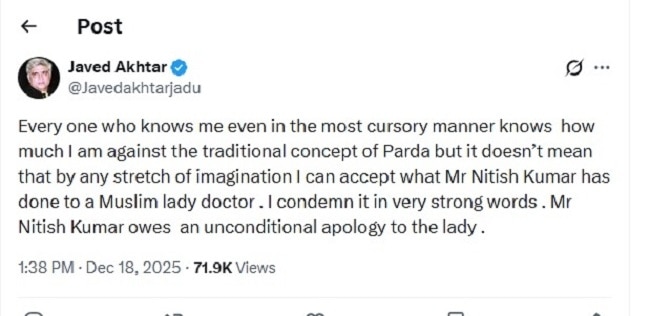जावेद अख्तर ने एक X पर पोस्ट कर अपनी बात कही. नीतीश कुमार के किए की निंदा करते हुए वो लिखते हैं- जो मुझे थोड़ा-बहुत भी जानते हैं... और ये जानते हैं कि मैं पर्दा के पारंपरिक कॉन्सेप्ट के कितना खिलाफ हूं. लेकिन इसका ये मतलब कतई नहीं कि मैं नीतीश कुमार के एक मुस्लिम महिला डॉक्टर के साथ किए गए व्यवहार को स्वीकार कर सकता हूं. मैं इसकी बहुत सख्ती से निंदा करता हूं. नीतीश कुमार को उस महिला से बिना शर्त माफी मांगनी चाहिए.