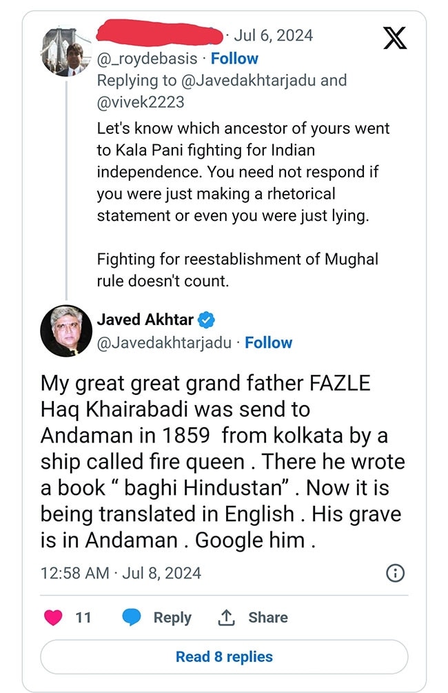 ये बात यहीं नहीं रुकी, एक दूसरे यूजर ने इस कन्वर्सेशन के बीच कूदते हुए जावेद अख्तर से सवाल किया कि उनके कौन से पूर्वज स्वतंत्रता संग्राम में लड़ते हुए काला पानी गए थे? इसके जवाब में जावेद अख्तर ने लिखा, 'मेरे परदादा फजले हक खैराबादी को 1859 में कोलकाता से, फायर क्वीन नाम के एक जहाज से अंडमान भेजा गया था. वहां उन्होंने एक किताब लिखी थी 'बागी हिंदुस्तान'. अब इसे इंग्लिश में ट्रांसलेट किया जा रहा है. उनकी कब्र अंडमान में है. उनके बारे में गूगल कर लीजिए.'