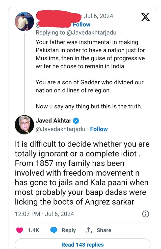 सोशल मीडिया प्लेटफॉर्म एक्स पर एक यूजर ने जावेद को उनके एक मजाकिया पोस्ट पर ट्रोल करना शुरू किया और उनके पिता की देशभक्ति पर सवाल कर दिया. जावेद अख्तर ने इस यूजर को पूरी गर्मी के साथ जवाब देने में कोई कमी नहीं छोड़ी.
