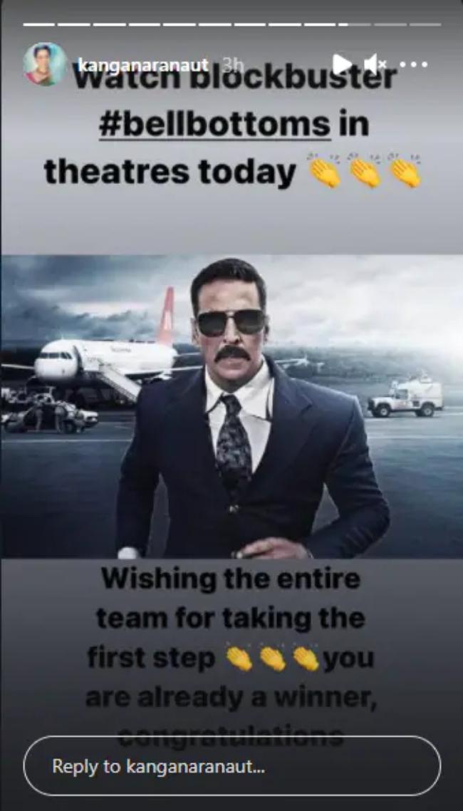कंगना ने फिल्म 'बेल बॉटम' को देखने के बाद अक्षय कुमार के साथ-साथ फिल्म की पूरी टीम की तारीफ की है. कगंना ने अपनी इंस्टा स्टोरी पर फिल्म की फोटो शेयर करते हुए कहा है, 'आज ही ब्लॉकबस्टर फिल्म बेल बॉटम को सिनेमाघरों में देखें. पूरी टीम को पहना कदम उठाने के लिए बधाई. आप अभी से विनर है.'