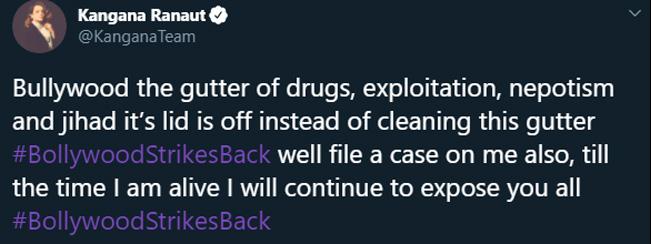 कंगना ने सिलसिलेवार ट्वीट्स में लिखा- बुलीवुड जो ड्रग्स, शोषण, नेपोटिज्म और जिहाद का गटर है. बजाए के इसे साफ करने के, बॉलीवुड स्ट्राइक्स बैक जैसे हैशटैग्स का इस्तेमाल किया जा रहा है. मैं तो कहती हूं कि मुझ पर भी केस कर दो. जब तक मैं जिंदा हूं तब तक मैं तुम सभी को एक्सपोज करती रहूंगी.
