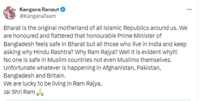 कंगना ने X पर शेख हसीना के इस्तीफा देकर देश छोड़ने की खबर को शेयर करते हुए लिखा- भारत हमारे आस-पास के सभी इस्लामिक गणराज्यों की मूल मातृभूमि है. हम सम्मानित और खुश हैं कि बांग्लादेश की माननीय प्रधानमंत्री भारत में सुरक्षित महसूस करती हैं, लेकिन भारत में रहने वाले सभी लोग पूछते रहते हैं कि हिंदू राष्ट्र क्यों? राम राज्य क्यों? खैर, ये स्पष्ट है कि क्यों!!! मुस्लिम देशों में कोई भी सुरक्षित नहीं है. यहां तक कि खुद मुसलमान भी नहीं. अफगानिस्तान, पाकिस्तान, बांग्लादेश और ब्रिटेन में जो कुछ भी हो रहा है, वो दुर्भाग्यपूर्ण है. हम भाग्यशाली हैं कि हम राम राज्य में रह रहे हैं. जय श्री राम!!