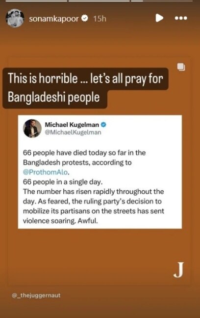 बॉलीवुड एक्ट्रेस सोनम कपूर ने भी बांग्लादेश में धधकती हिंसा की आग पर चिंता जाहिर की है. सोनम ने इंस्टाग्राम पर स्टोरी शेयर कर लिखा- ये भयानक है. आइए हम सब बांग्लादेशी लोगों के लिए प्रार्थना करें.