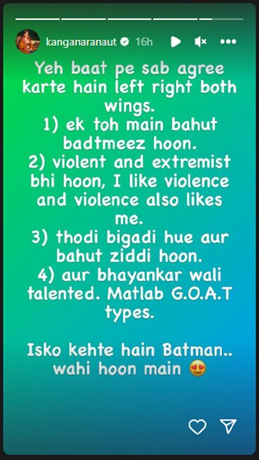 कंगना का ये पोस्ट इंडस्ट्री के लोगों से मिली तारीफों के बाद आया है. कंगना ने लिखा- ये बात पर सब मानते हैं, लेफ्ट राइट दोनों विंग वाले. 1- एक तो मैं बहुत बदतमीज हूं. 2- उग्र और अतिवादी भी हूं. मुझे वायलेंस पसंद है. और हिंसा को भी मैं बहुत पसंद हूं. 3- थोड़ी बिगड़ी हुई और बहुत जिद्दी हूं. 4- और भयंकर वाली टैलेंटेड. मतलब ग्रेट ऑफ ऑल टाइम्स टाइप वाली. इसको कहते हैं बैटमैन, वहीं हूं मै.