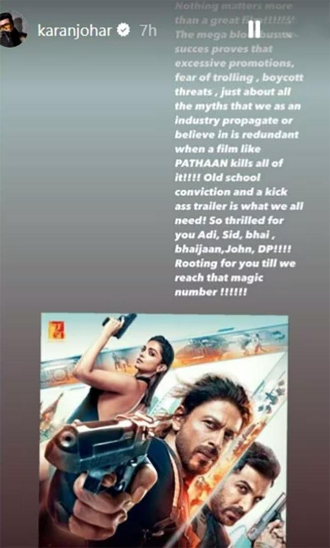 आलिया भट्ट, अनुष्का शर्मा, अजय देवगन समेत तमाम बॉलीवुड स्टार्स 'पठान' की तारीफ में बहुत कुछ लिख चुके हैं. वहीं अब करण जौहर ने भी 'पठान' को लेकर अपने मन की बात शेयर की है. करण जौहर अपनी इंस्टा स्टोरी में लिखते हैं, 'एक अच्छी फिल्म से ज्यादा कुछ मायने नहीं रखता है. मेगा ब्लॉकबस्टर की सक्सेस साबित करती है कि ज्यादा प्रमोशनल, ट्रोलिंग का डर, बायकॉट की धमकियां, सब एक मिथक है, जिस पर हम विश्वास करते हैं. वहीं 'पठान' ने इन सभी बातों को झूठा साबित कर दिया है.'