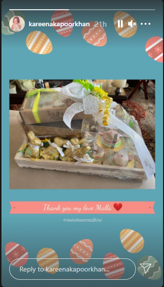 करीना ने ये तस्वीर अपने इंस्टाग्राम स्टोरी पर शेयर की है. पिक्चर को शेयर करते हुए एक्ट्रेस ने लिखा, "थैंक यू माय लव मल्ला" वहीं साथ में एक हार्ट इमोटिकॉन भी पोस्ट किया है. करीना और मलाइका एक दूसरे के काफी करीब हैं. दोनों एक दूसरे के साथ स्पेशल बॉन्ड भी शेयर करते हैं. फोटो में देखा जा सकता है बॉक्स के अंदर एनिमल शेप चॉक्लेट्स दिखाई दे रही हैं जो गोल्डन पेपर से रैप है.
