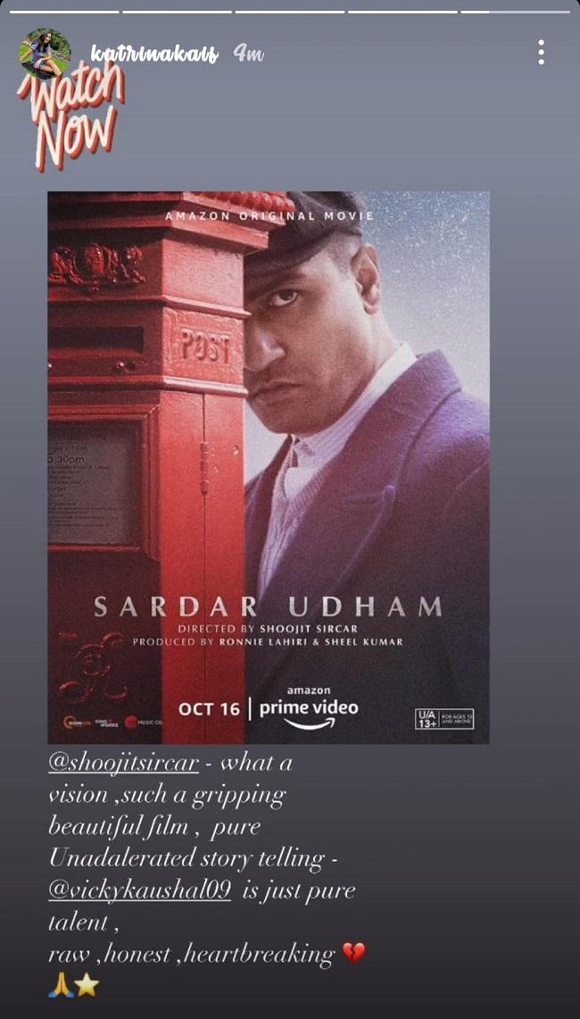 कथित बॉयफ्रेंड विक्की कौशल के काम ने कटरीना कैफ का दिल छू लिया है. यही वजह है कि वह फिल्म 'सरदार उधम' की तारीफ करते नहीं थक रही हैं. कटरीना ने फिल्म देखने के बाद अपनी इंस्टाग्राम स्टोरी पर अपने रिव्यू को लिखा.
