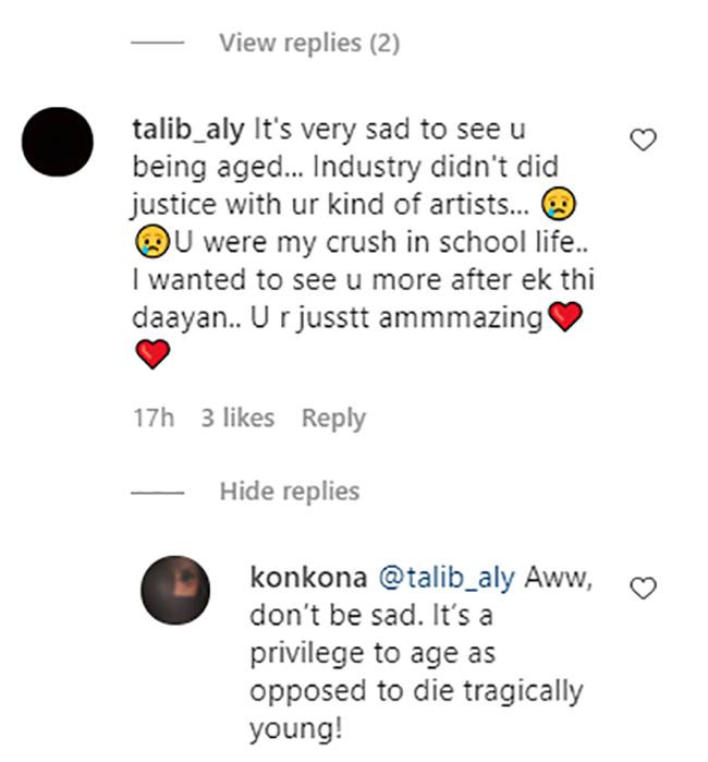 यूजर ने लिखा था 'आपकी बढ़ती उम्र को देख दुख होता है....इंडस्ट्री ने आप जैसे कलाकारों के साथ न्याय नहीं किया....आप स्कूल में मेरी क्रश हुआ करती थीं...एक थी डायन के बाद मैं आपकी और फिल्में देखना चाहता था. आप बेहतरीन हैं.' यूजर ने अपने इस कमेंट में कोंकणा की तारीफ भी है लेकिन साथ में एक्ट्रेस की उम्र पर भी रोशनी डाली. इस कमेंट का कोंकणा ने बड़ी ही शालीनता से जवाब दिया.