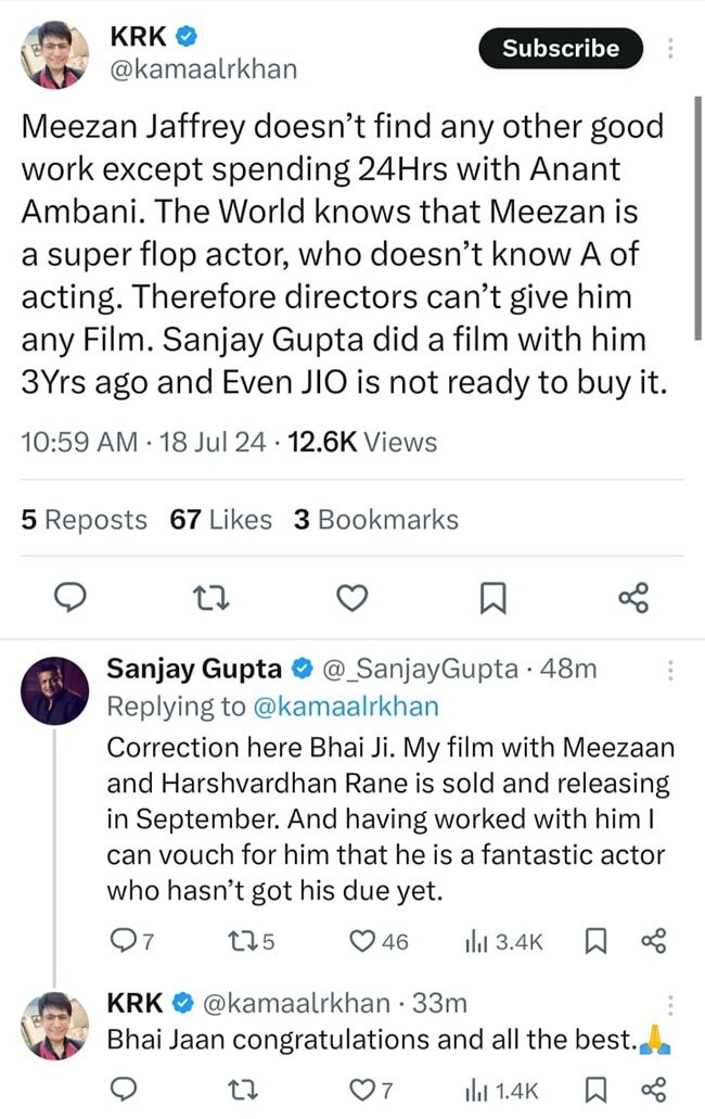 अपनी पोस्ट में KRK ने लिखा, 'मीजान जाफरी को, अनंत अंबानी के साथ 24 घंटे बिताने के अलावा, कोई ढंग का काम नहीं मिलता. दुनिया जानती है कि मीजान एक 'सुपर फ्लॉप' एक्टर हैं, जिन्हें एक्टिंग का 'ए' नहीं आता. इसलिए डायरेक्टर उन्हें फिल्में नहीं देते. संजय गुप्ता ने 3 साल पहले उनके साथ एक फिल्म की थी और अब जियो भी उसे खरीदने के लिए तैयार नहीं है.'