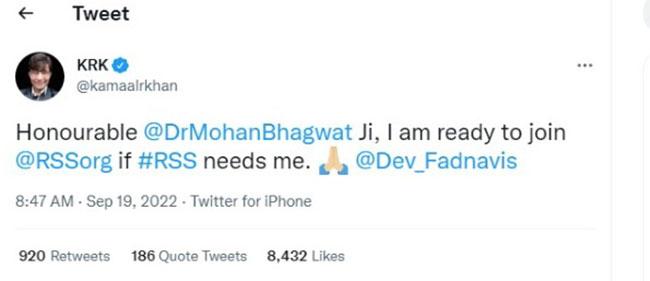 केआरके ने ट्वीट कर RSS ज्वॉइन करने की इच्छा जताई है. उन्होंने लिखा- आदरणीय, मोहन भागवत जी, मैं RSS में भर्ती होने के लिए तैयार हूं. अगर RSS को मेरी जरूरत है तो. इस ट्वीट के साथ केआरके ने फोल्डिंग हैंड इमोजी बनाया है. साथ ही देवेंद्र फडणवीस, मोहन भागवत और RSS को टैग किया है. केआरके ने तो अपने मन की बात बता दी, लेकिन उनके ट्वीट पर यूजर्स मजेदार रिएक्शन दे रहे हैं.