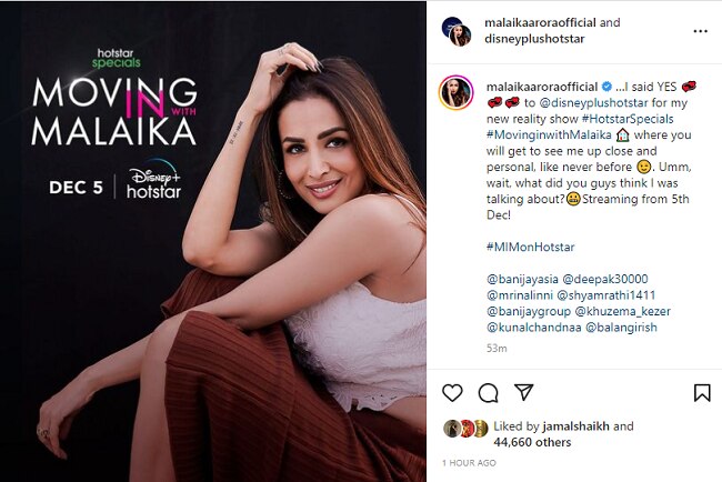 अपने रियलिटी शो का ऐलान करते हुए मलाइका अरोड़ा ने लिखा, 'मैंने डिज्नी प्लस हॉटस्टार को हां कह दिया, मेरे नए रियलिटी शो हॉटस्टार स्पेशल शो मूविंग विद मलाइका के लिए. इसमें आप मुझे करीब से देखेंगे और पर्सनली जान पाएंगे जैसा पहले कभी नहीं हुआ. एक मिनट, आप लोगों को क्या लग रहा था? 5 दिसम्बर से ये शो स्ट्रीम होगा.'