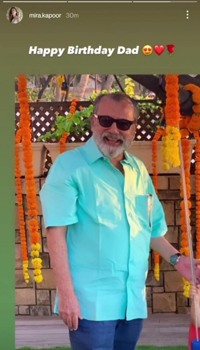 अपने इंस्टाग्राम की स्टोरीज में मीरा राजपूत ने पंकज कपूर की प्यारी-सी फोटो शेयर करते हुए लिखा - हैप्पी बर्थडे डैड. इस फोटो में पंकज कपूर हंसते हुए कैमरा की ओर देख रहे हैं. उन्होंने स्काई ब्लू शर्ट और डेनिम पहनी हुई है. साथ ही आंखों पर काला चश्मा लगाया हुआ है. फोटो देखकर लगता है कि यह किसी सेलिब्रेशन की है. पंकज कपूर के बैकग्राउंड में गेंदे के फूल की सजावट को भी देखा जा सकता है.